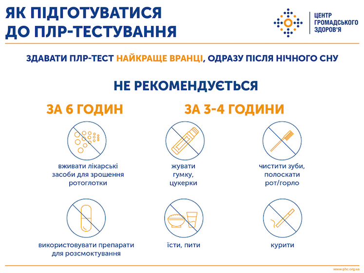 «Тести пулімеразної ланцюгової реакції (ПЛР) наразі вважаються найефективнішим методом для визначення інфікування COVID-19. ПЛР-дослідження показує наявність чи відсутність в організмі людини ДНК або РНК вірусу. У Центрі громадського здоров'я надали кілька рекомендацій, як пацієнти можуть підготуватися до ПЛР-тесту. Найперше зазначається, що здавати тест найкраще вранці, одразу після нічного сну. Перед проходженням ПЛР-тестування пацієнту НЕ рекомендується: за 6 годин вживати лікарські засоби для зрошення ротоглотки; використовувати препарати для розсмоктування. За 3-4 години: жувати гумку чи цукерки; чистити зуби, полоскати горло чи рот; їсти чи пити; курити», – йдеться у повідомленні.