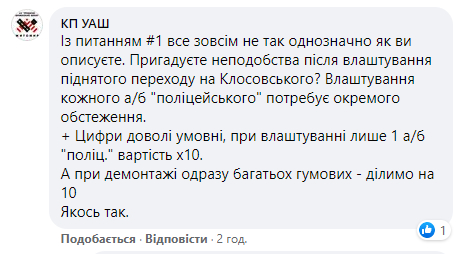 «На минулому засідання підняв питання резинових лежачих, які кожного року демонтують на зиму і знову весною монтують. Фактично, пів року безпекою пішоходів нехтують заради прибирання снігу (особливо цієї зими). В КП «УАШ» за нашим дорученням провели розрахунки вартості 1 м погонного лежачого поліцейського: резиновий коштує 1500 грн, щорічно 600 грн на монтаж і відповідно 600 на демонтаж, а асфальтобетонний 600 грн і ніяких робіт. Вигода для бюджету очевидна, плюс безпека цілий рік. Сподіваюсь, нинішня практика відійде в минуле. Цікаво, хто колись придумав таку схему...», - написав Роман Кравчук.