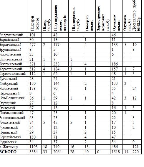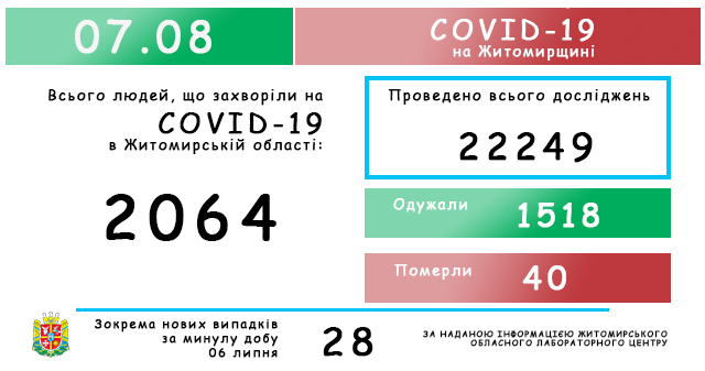 Станом на 9.00 7 серпня в Житомирській області 2064 лабораторно підтверджених випадки коронавірусу, з них 28 виявлені упродовж останньої доби.