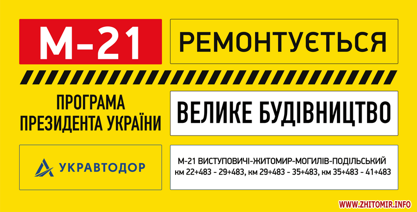 «Вперше за 40 років розпочато реконструкцію ще трьох ділянок шляху М-21. Відповідно до проєкту «Велике будівництво» на території Житомирської області планується відновити більше 50 кілометрів шляху М-21 Виступовичі – Житомир – Могилів-Подільський. У Овруцькому районі розпочато ремонтні роботи на ще 19-ти кілометрах автомобільної дороги загального користування державного значення М-21 Виступовичі – Житомир – Могилів-Подільський (ділянки: км 22+483 - 29+483, 29+483 - 35+483 та 35+483 - 41+483). Ці ділянки шляху капітально ремонтувалися лише в 80-ті роки минулого століття, а до цього часу ремонт проводився за рахунок експлуатаційного утримання», - йдеться у повідомленні.