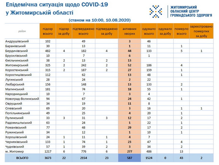 Нагадаємо, за даними Житомирського обласного лабораторного центру станом на ранок 10 серпня в області всього зафіксовано 2154 випадки COVID-19, одужало всього 1524 людей, померло 43.