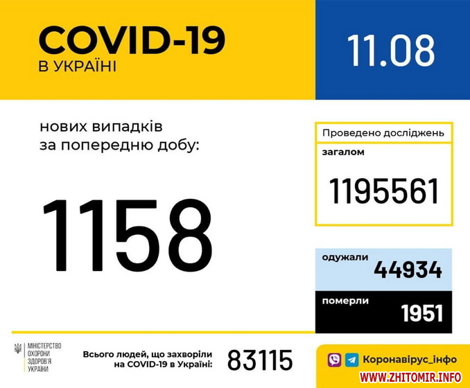 Як повідомляв Житомир.info, 10 серпня, за даними МОЗ, в Україні було зафіксовано 81957 випадків коронавірусу, за добу 1008 нових інфікувань.