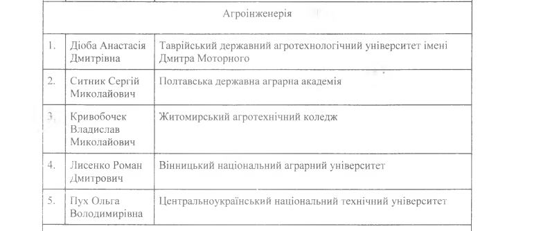 Серед цьогорічних стипендіатів є один студент житомирського вузу: Кривобочек Владислав Миколайович, який навчається в Житомирському агротехнічному коледжі.