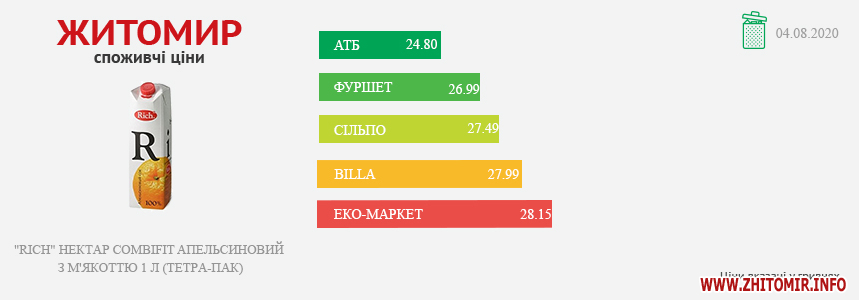 МОНІТОРИНГ ЗДІЙСНЕНО МЕТОДОМ КОНТРОЛЬНОЇ ЗАКУПІВЛІ, У МІСЦЯХ ПРОДАЖУ: AТБ, пр. Миру, 15 А, Billa, пр. Миру, 15, ЕКО-маркет, вул. Мала Бердичівська, 2/7, Сільпо, майдан Житній ринок, 1, Фуршет, вул. Вітрука, 9 а