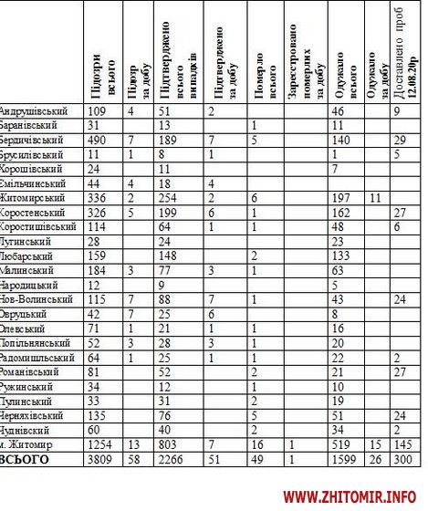 «За даними Житомирського обласного лабораторного центру станом на 09:00 13.08.2020 (за минулу добу – 12 серпня) зареєстровано 51 нових лабораторно підтверджених випадки», - йдеться у повідомленні.