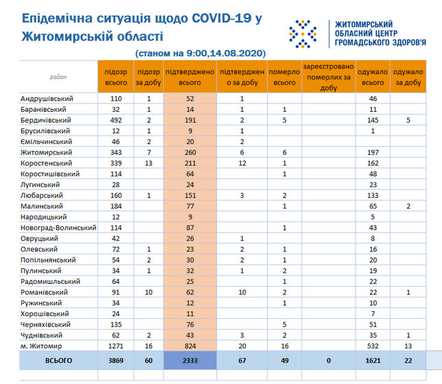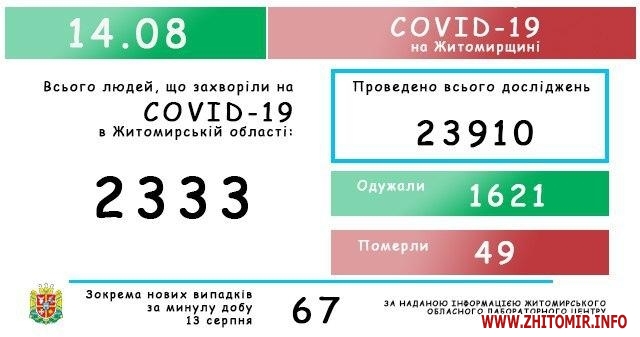 Станом на ранок 14 серпня в Житомирській області лабораторно підтверджено 2333 випадки коронавірусу, з них 67 – нові, встановлені упродовж останньої доби.