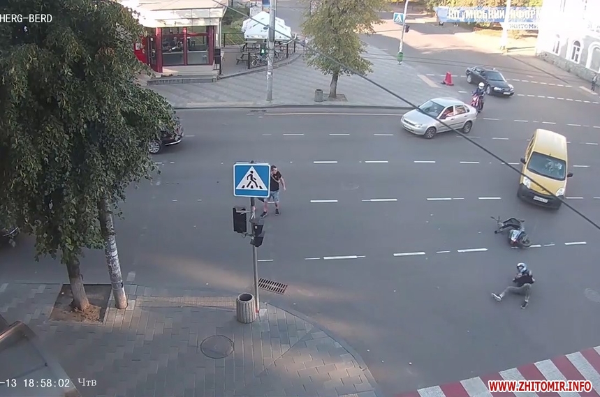 У Житомирі на вулиці Великій Бердичівській 13 серпня Renault в'їхав у скутериста, від удару водій двоколісника злетів зі скутера і перекинувся.