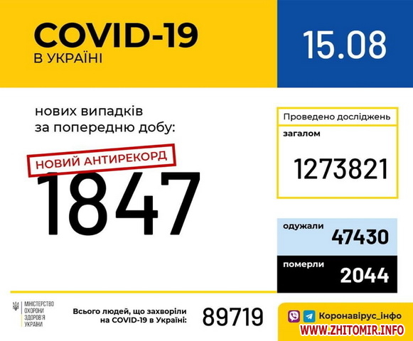 «15 серпня (станом на 9:00) в Україні 89 719 лабораторно підтверджених випадків COVID-19, з них 2 044 летальних, 47 430 пацієнтів одужало. За добу зафіксовано 1 847 нових випадків. Загалом проведено