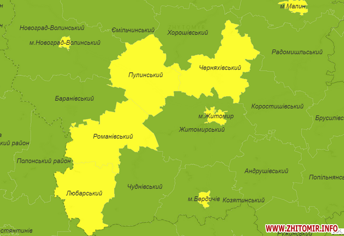 За даними карти, в жовтій зоні незмінно з минулого тижня міста Житомир та Бердичів, приєдналися до них Малин та Новоград-Волинський. Серед районів «жовтими» залишились Любарський, Романівський та Пулинський і додався Черняхівський район. Натомість Житомирський район став «зеленим».