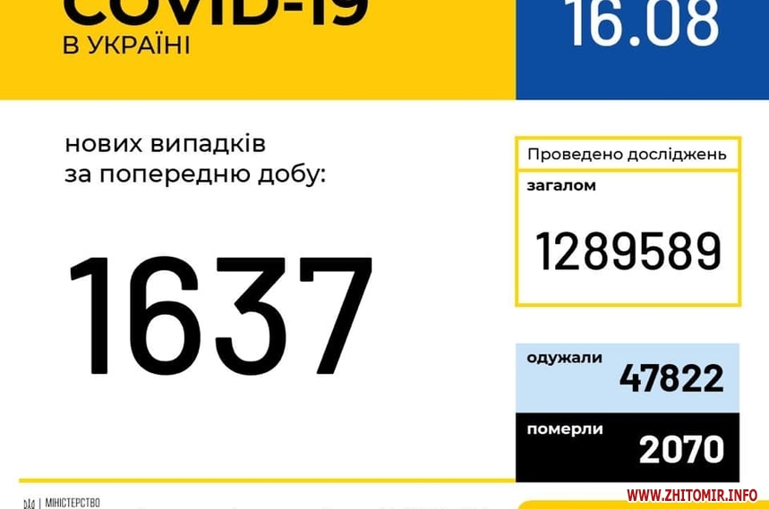 «В Україні зафіксовано 1 637 нових випадків коронавірусної хвороби COVID-19. 16 серпня (станом на 9:00) в Україні 91 356 лабораторно підтверджених випадків COVID-19, з них 2 070 летальних, 47 822 пацієнти одужало. За добу зафіксовано 1637 нових випадків. Загалом проведено 1 289 589 тестувань методом ПЛР. Усього за добу одужало 392 пацієнти», - йдеться в повідомленні.