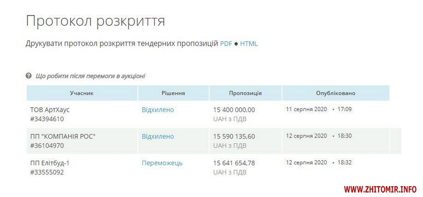 12 серпня департамент регіонального розвитку житомирської ОДА опублікував повідомлення про намір укласти договір третім учасником торгів - з ПП “Елітбуд-1”.
