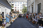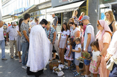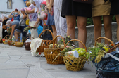 Біля церков продають букети, мед та фрукти. Яблука від 20 до 40 грн, груші по 25, мед від 30 за 200 грн за баночку, є також мед у сотах. Букети коштують від 10 до 50 гривень.