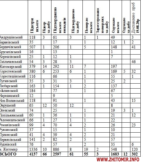 Як повідомляв Житомир.info, 19 серпня зафіксовано 52-й летальний випадок від коронавірусної інфекції помер 68-річний житель Житомирського району.