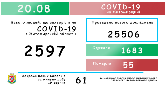 «За даними Житомирського обласного лабораторного центру станом на 09:00 20.08.2020 (за минулу добу – 19 серпня) зареєстровано 61 новий лабораторно підтверджених випадок», - йдеться у повідомленні.