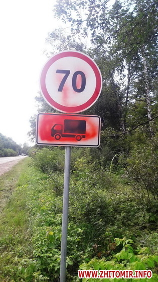 На трасі Р-18 «Житомир – Попільня – Сквира – Володарка – Ставище» пошкоджено 5 нових дорожніх знаків: хто розпилив на них фарбу.