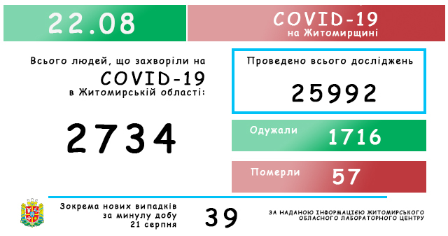 За добу 21 серпня (станом на 9:00 год. 22 серпня) в Житомирській області зареєстрували 39 нових лабораторно підтверджених випадків хвороби COVID-19. Також зафіксовано два летальні випадки.