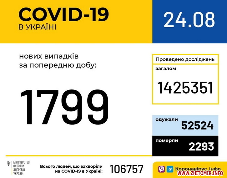 Станом на ранок 24 серпня в Україні виявили понад 106,7 тисячі випадків коронавірусної хвороби, з них вже одужали 52,5 тисячі осіб, померли 2293 людини. За добу в країні підтвердили 1799 нових випадків COVID-19, в тому числі в Житомирській області – 43.