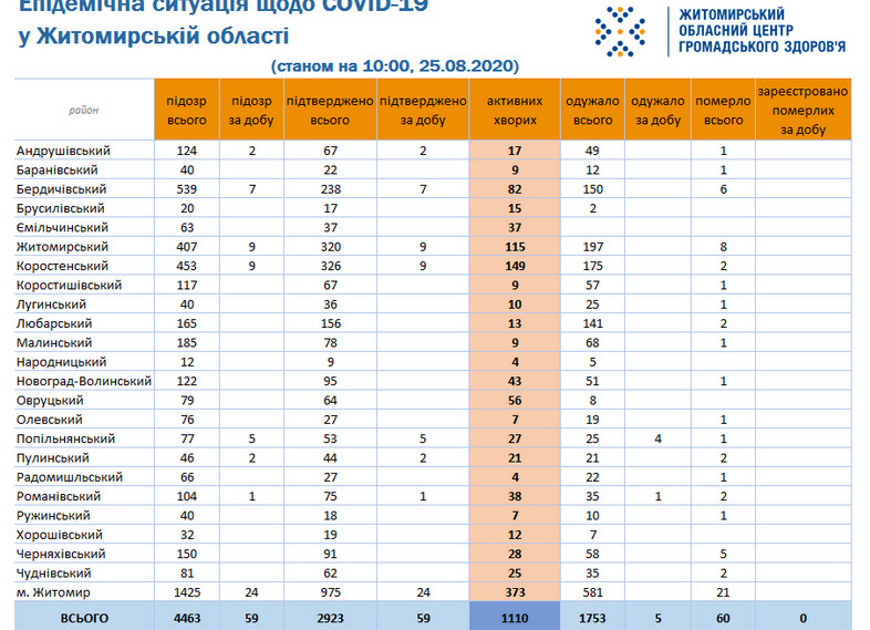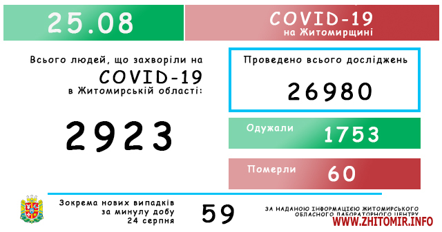 Станом на 9.00 25 серпня в Житомирській області лабораторно підтверджено 2923 випадки коронавірусу, з них 59 - встановлені упродовж останньої доби.
