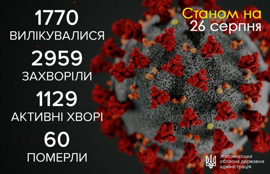 За минулу добу, 25 серпня (станом на 09:00 год. 26.08), в Житомирській області зареєстровано 36 нових лабораторно підтверджених випадків коронавірусної хвороби COVID-19. Усього за період пандемії вірус виявили у 2959 жителів області.