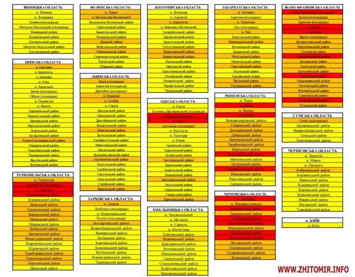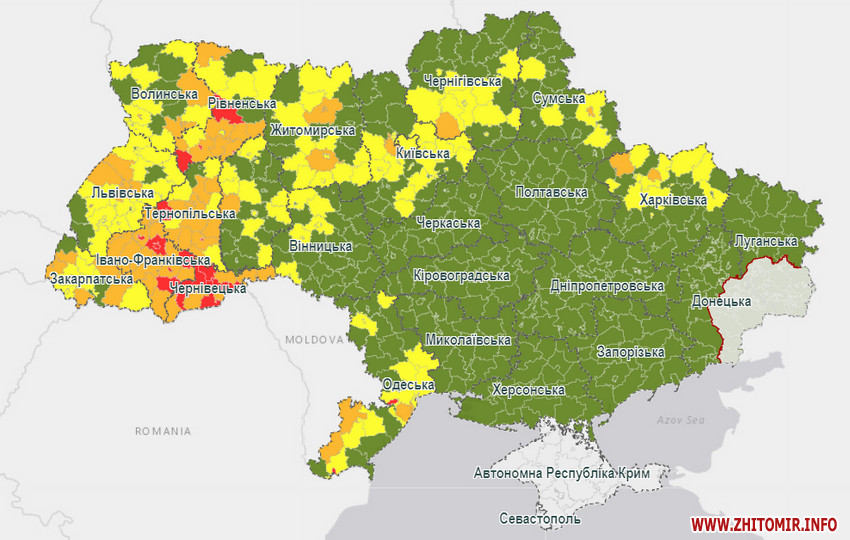 до помаранчевої зони потрапили місто Коростень, Житомирський та Коростенський райони;