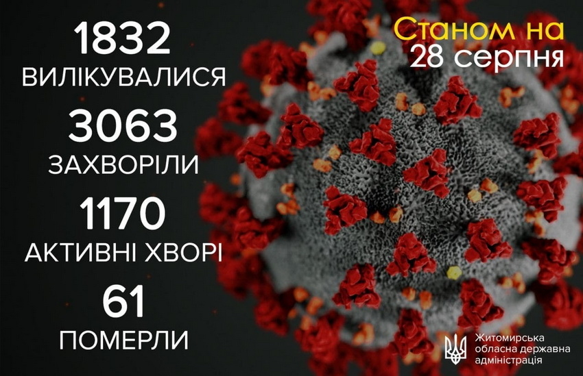 Як повідомляв Житомир.info, станом на 27 серпня у Житомирській області було зафіксовано 2998 випадків COVID-19, з них нових – 39 випадків. За весь час пандемії в області померла 61 особа.