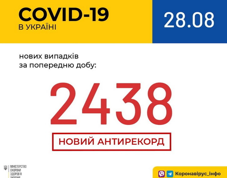 За даними пресслужби МОЗ, 28 серпня в Україні зафіксовано черговий антирекорд - 2438 нових випадків коронавірусної хвороби COVID-19.
