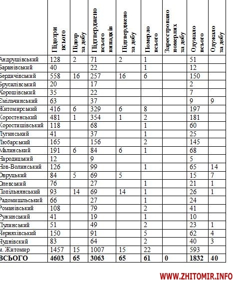 «За даними Житомирського обласного лабораторного центру станом на 09:00 28.08.2020 (за минулу добу – 27 серпня) зареєстровано 65 нових лабораторно підтверджених випадків», - йдеться у повідомленні.