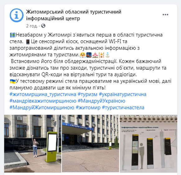 «Незабаром у Житомирі з’явиться перша в області туристична стела. Це сенсорний кіоск, оснащений WI-FI та запрограмований ділитись актуальною інформацією з житомирянами та туристами. Встановимо його біля облдержадміністрації. Кожен бажаючий зможе дізнатись там про заходи, туристичні об’єкти, маршрути та відсканувати QR-коди на віртуальні тури та аудіогіди. У тестовому режимі стела працюватиме українською мовою, далі плануємо додавати ще як мінімум п'ять», – йдеться у дописі.