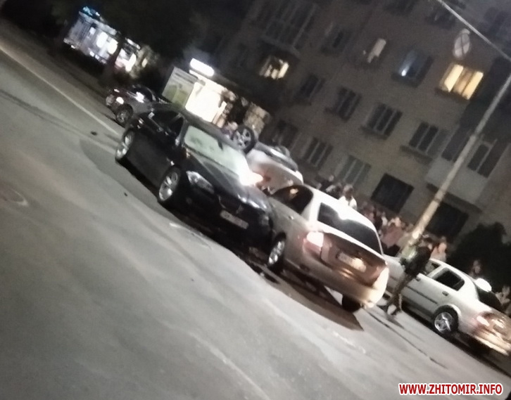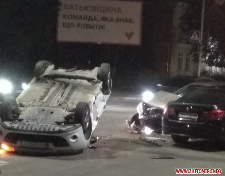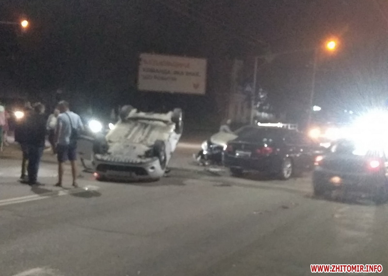 У ніч на 29 серпня на перехресті вулиць Київської та Івана Мазепи в Житомирі зіштовхнулися легкові автомобілі, один з яких перекинувся на дах.