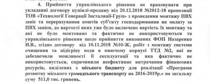 На сайті Держаудитслужби оприлюднений звіт від 6 липня 2020 року про проведення Північним офісом Держаудитслужби в Житомирській області фінансового аудиту КП «Житомирське трамвайно-тролейбусне управління» за період 2017-2019 років, у якому встановлено ряд порушень,зокрема, розтрату 511 тис. грн на закупівлі теплозахисних штор на ворота депо та монтажі миючого комплексу, які по технічним причинам не можуть використовуватися підприємством.