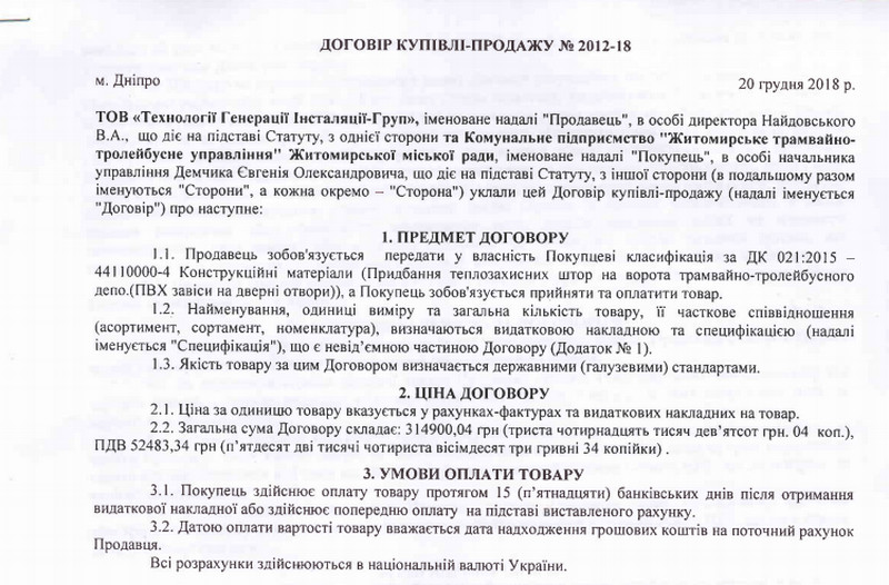 На ресурсі ProZorro міститься інформація про укладений 20 грудня 2018 року договір на 314,9 тис. грн між ТТУ та ТОВ «Технології Генерації Інсталяції-Груп» на поставку теплозахисних штор на ворота депо (ПВХ-завіси). Даний договір був підписаний колишнім начальником КП «Житомирське ТТУ» Євгенієм Демчиком.
