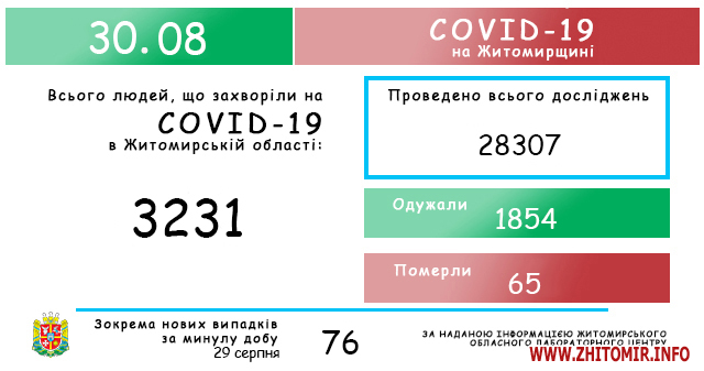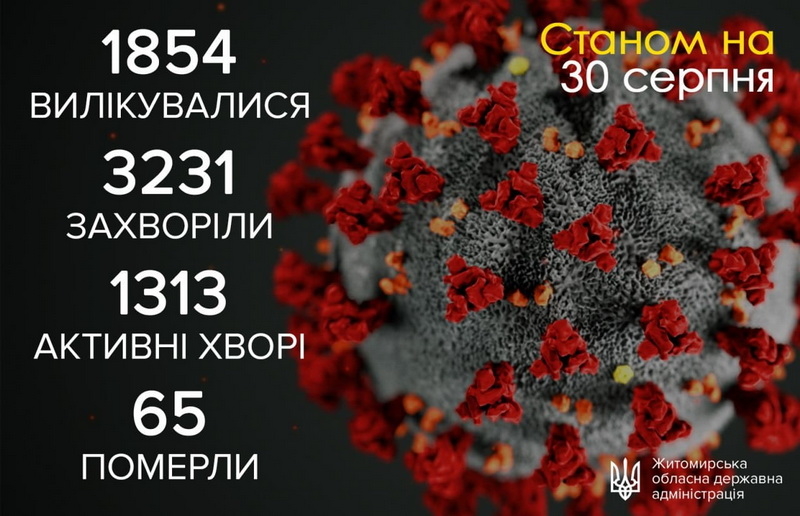 Станом на 30 серпня у Житомирській області зареєстровано 3231 випадок коронавірусної хвороби, з них 76 нових випадків. Також за останню добу в області зафіксовано 4 летальні випадки.