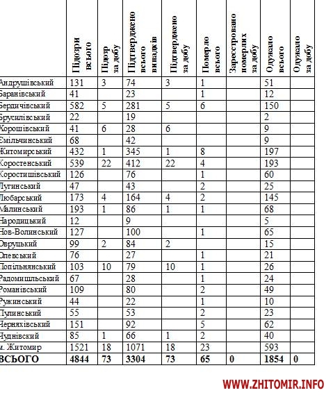 «За даними Житомирського обласного лабораторного центру станом на 09:00 31.08.2020 (за минулу добу – 30 серпня) зареєстровано 73 нових лабораторно підтверджених випадки», -