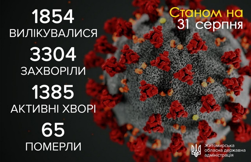 Як повідомляв Житомир.info, станом на 30 серпня у Житомирській області було зареєстровано 3231 випадок коронавірусної хвороби, з них 76 нових випадків. Також за добу в області зафіксовано 4 летальні випадки.