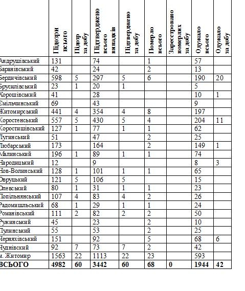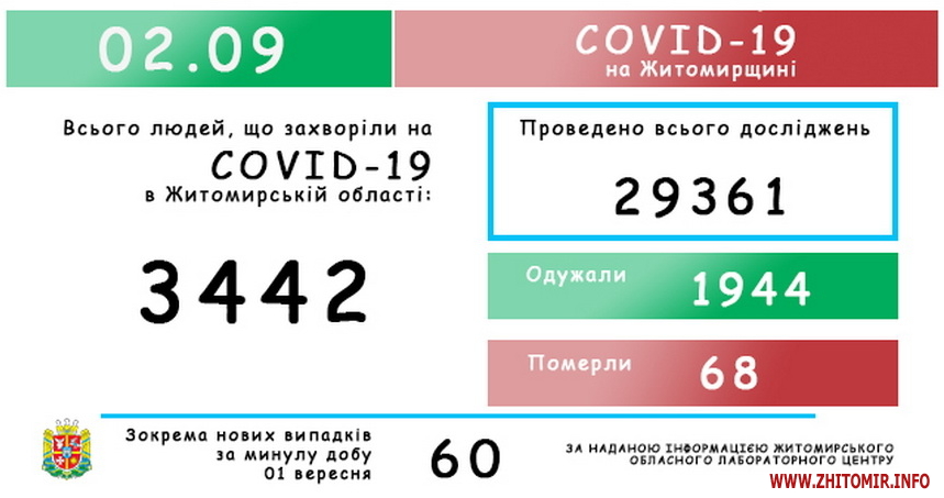 «За даними Житомирського обласного лабораторного центру станом на 09:00 02.09.2020 (за минулу добу – 01 вересня) зареєстровано 60 нових лабораторно підтверджених випадків.