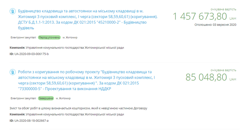Закупівлю послуг з будівництва кладовища та автостоянки на міському кладовищі по Західному шосе в Житомирі (3 пусковий комплекс, І черга) проводить управління комунального господарства. Планується побудувати чотири сектори кладовища – 58,59, 60 та 61.