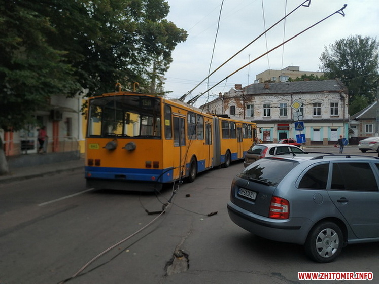 У Житомирі на вулиці Театральній 3 вересня на проїжджу частину впала електроопора і обірвала тролейбусні проводи.