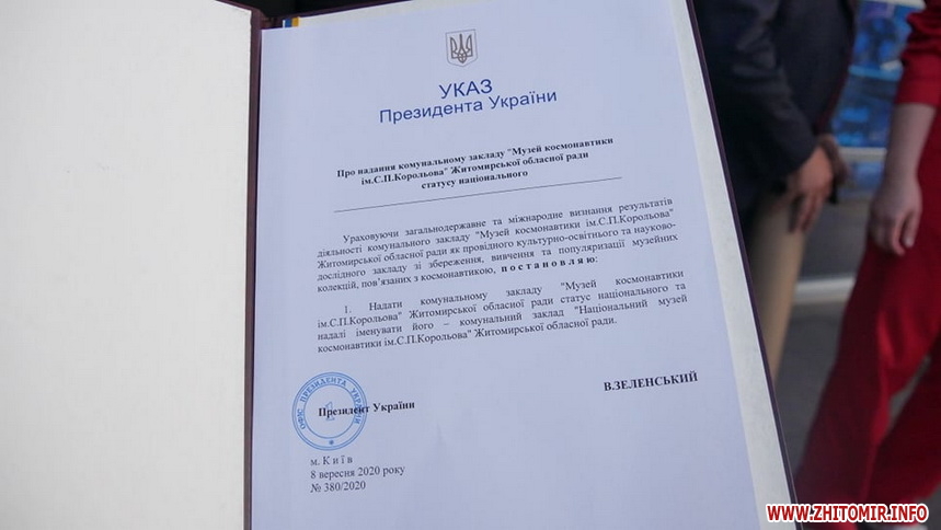 Нагадаємо, що 12 серпня Кабмін підтримав ініціативу Житомирської облдержадміністрації, Житомирської обласної ради, народних депутатів від Житомирщини щодо надання статусу національного Музею космонавтики імені Корольова й звернувся до президента з таким проханням. До речі, в першій половині дня 8 вересня під час візиту до Сумської області Зеленський присвоїв статус «національний» Сумському академічному театру драми та музичної комедії.