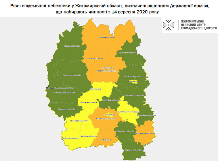 Центр громадського здоров’я також оновив карту рівнів епідемічної небезпеки на територіях, визначені рішенням Державної комісії з ТЕБ та НС від 10 вересня 2020 року.