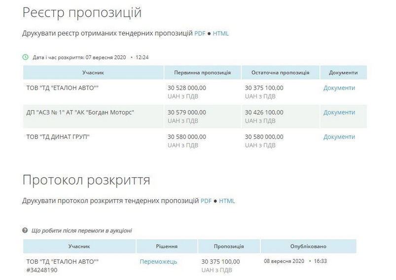 Участь у торгах взяло три фірми: ТОВ “ТД “Еталон Авто” з пропозицію у 30 млн 375 тис. 100 грн, ДП “АСЗ №1” АТ “АК Богдан Моторс” з пропозицією у 30 млн 426 тис. 100 грн та ТОВ “ТД Динат Груп” з пропозицією 30 млн 580 тис. грн.