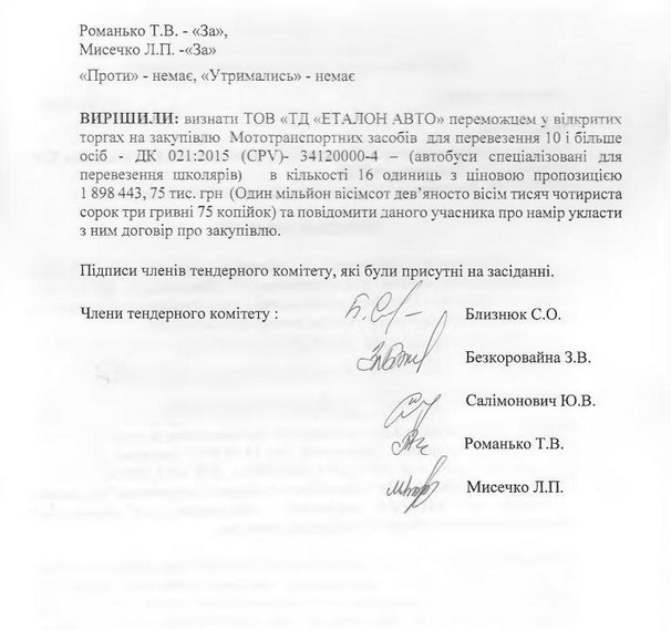 8 вересня управління освіти і науки Житомирської обласної державної адміністрації опублікувало повідомлення про намір укласти договір з ТОВ “ТД “Еталон Авто”, оскільки пропозиція фірми є найбільш економічно вигідною: 1 млн 898 тис. 443 грн 75 коп. за автобус.