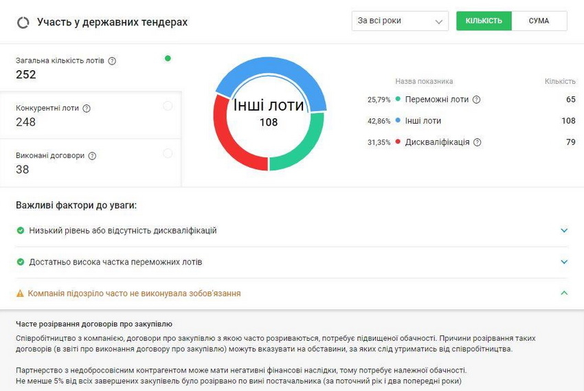Зауважимо, ТОВ “ТД “Еталон Авто” має 25,79% переможних лотів та у 31,35% тендерів фірму дискваліфікували. YouControl звертає увагу, що компанія підозріло часто не виконувала зобов’язання.