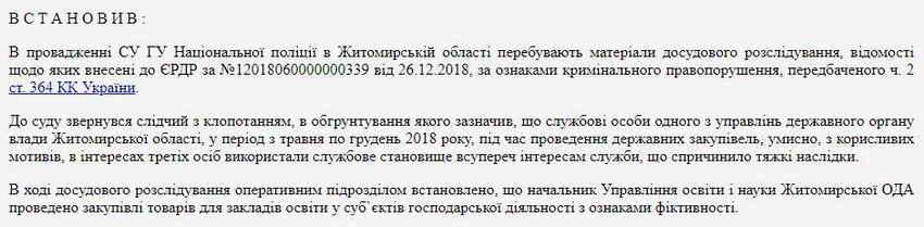 “До суду звернувся слідчий з клопотанням, в обгрунтуванні якого зазначив, що службові особи одного з управлінь державного органу влади Житомирської області у період з травня по грудень 2018 року, під час проведення державних закупівель, умисно, з корисливих мотивів, в інтересах третіх осіб використали службове становище всупереч інтересам служби, що спричинило тяжкі наслідки. В ході досудового розслідування оперативним підрозділом встановлено, що начальником управління освіти і науки Житомирської ОДА проведено закупівлі товарів для закладів освіти у суб`єктів господарської діяльності з ознаками фіктивності”, - йдеться в матеріалах справи.