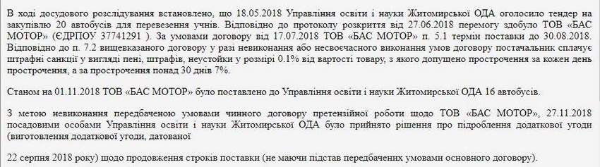 “В ході досудового розслідування встановлено, що 18.05.2018 управління освіти і науки Житомирської ОДА оголосило тендер на закупівлю 20 автобусів для перевезення учнів. Відповідно до протоколу розкриття від 27.06.2018 перемогу здобуло ТОВ «Бас Мотор». За умовами договору від 17.07.2018 ТОВ «Бас Мотор» термін поставки до 30.08.2018. Відповідно до п. 7.2 вищевказаного договору у разі невиконання або несвоєчасного виконання умов договору постачальник сплачує штрафні санкції у вигляді пені, штрафів, неустойки у розмірі 0.1% від вартості товару, з якого допущено прострочення за кожен день прострочення, а за прострочення понад 30 днів 7%. Станом на 01.11.2018 ТОВ «Бас Мотор» було поставлено до Управління освіти і науки Житомирської ОДА 16 автобусів. З метою невиконання передбаченою умовами чинного договору претензійної роботи щодо ТОВ «Бас Мотор», 27.11.2018 посадовими особами Управління освіти і науки Житомирської ОДА було прийнято рішення про підроблення додаткової угоди (виготовлення додаткової угоди, датованої 22 серпня 2018 року) щодо продовження строків поставки (не маючи підстав передбачених умовами основного договору)”, - йдеться в матеріалах справи.