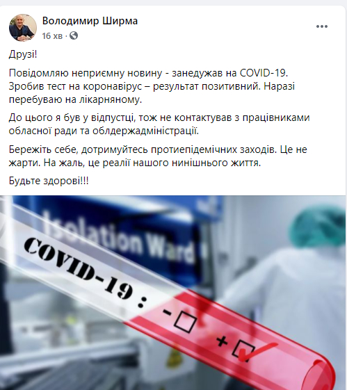 «Друзі! Повідомляю неприємну новину - занедужав на COVID-19. Зробив тест на коронавірус – результат позитивний. Наразі перебуваю на лікарняному. До цього я був у відпустці, тож не контактував з працівниками обласної ради та облдержадміністрації. Бережіть себе, дотримуйтесь протиепідемічних заходів. Це не жарти. На жаль, це реалії нашого нинішнього життя. Будьте здорові!!!», - повідомив Володимир Ширма.