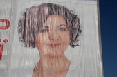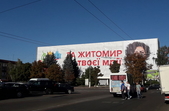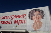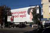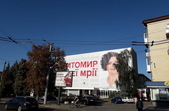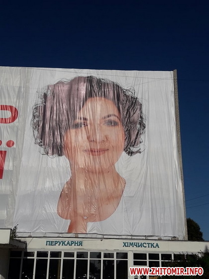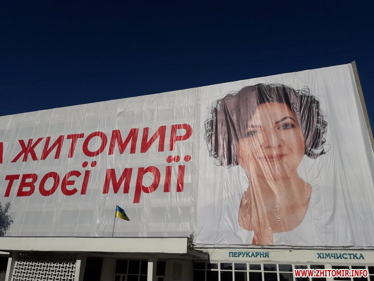 Тепер банер на фасаді однозначно асоціюється з виборчою кампанією Олени Розенблат, яка збирається балотуватися на посаду мера Житомира від ВО «Батьківщина».