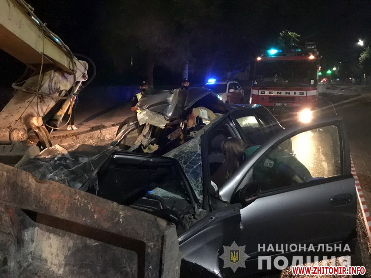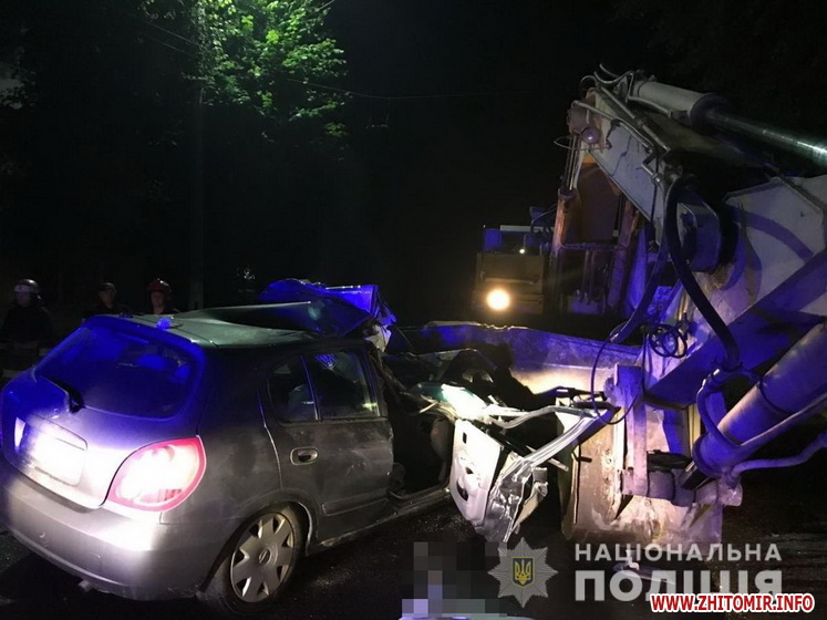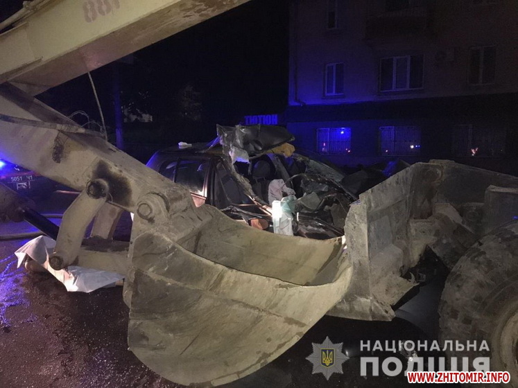 «Попередньо, близько 2:30на перехресті вулиць Великої Бердичівської та Гагаріна водій автомобіля «Nissan Almera», 21-річний житель Житомирського району, рухаючись у напрямку вулиці Жуйка, не впорався з керуванням та здійснив зіткнення з нерухомим екскаватором, що знаходився на автошляху. Унаслідок ДТП 19-річний пасажир іномарки, житель Народицького району, загинув на місці події. Інший пасажир, 21-річний житель Житомирського району, з травмами був ушпиталений до відділення інтенсивної терапії Житомирської обласної клінічної лікарні. Водій автомобіля після отримання медичної допомоги був направлений на амбулаторне лікування», – йдеться у повідомленні.
