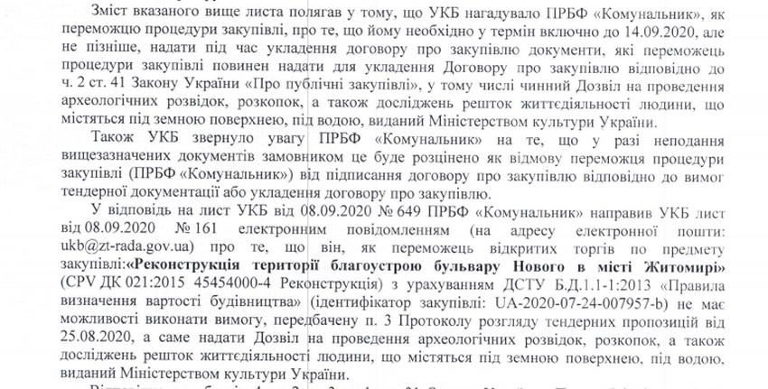 Згідно з даним протоколом, управління капітального будівництва Житомирської міської ради відхилило пропозицію ПРБФ «Комунальник» у 17,7 млн грн на реконструкцію Нового бульвару. Підставою для такого рішення стало те, що переможець повинен був до 14 вересня надати перелік документів, у тому числі дозвіл на проведення археологічних розвідок, розкопок, а також досліджень решток життєдіяльності людини, що містяться під земною поверхнею, під водою, виданий Міністерством культури України. Проте 8 вересня переможець торгів надіслав до УКБ лист, у якому повідомив, що не має можливості виконати дану вимогу.
