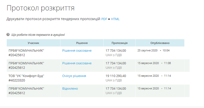 Про це йдеться в протоколі розгляду тендерних пропозицій від 15 вересня, оприлюдненому на ресурсі ProZorro.