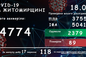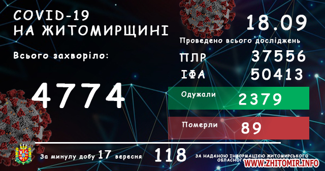 Станом на ранок 18 вересня у Житомирській області лабораторно підтверджено 4774 випадки COVID-19, з яких 118 виявлені упродовж останньої доби.